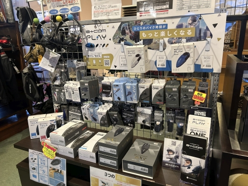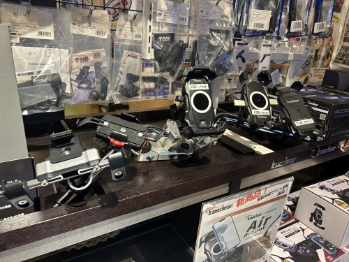 | スマートフォンホルダー コーナー 「カルド・デイトナ」 | ヘルメット用インカム コーナー B+COM デモ機ございます。 | ||||||||||||